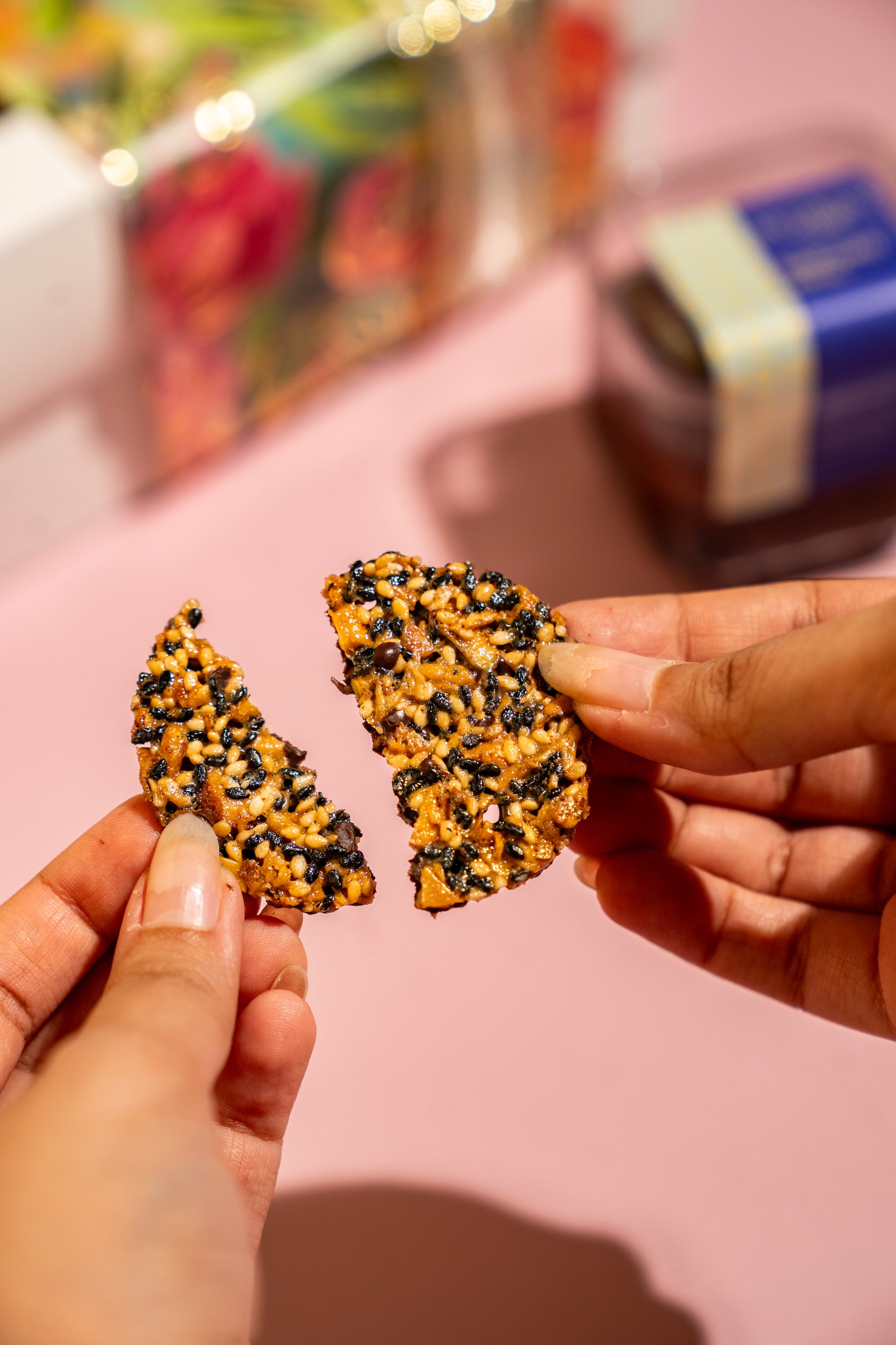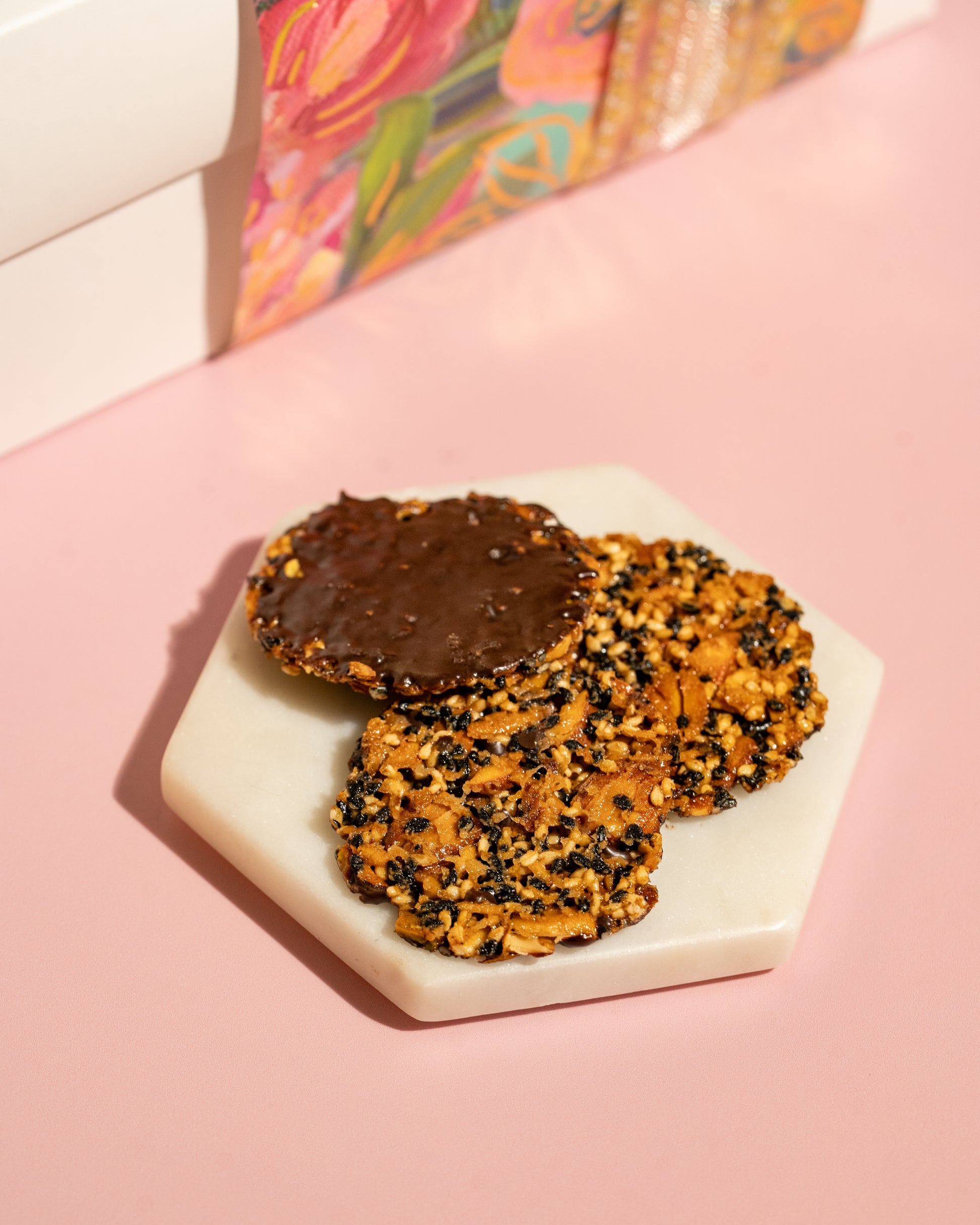 Thin, crisp florentines made with roasted sesame and caramelised sugar, dipped in rich dark chocolate. A perfect balance of nutty, toasty, and bittersweet.