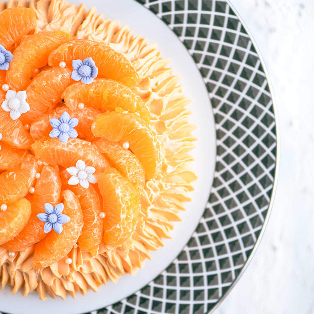 Moist orange sponge topped with zesty orange cream and a drizzle off rich chocolate and lots of fresh orange slices