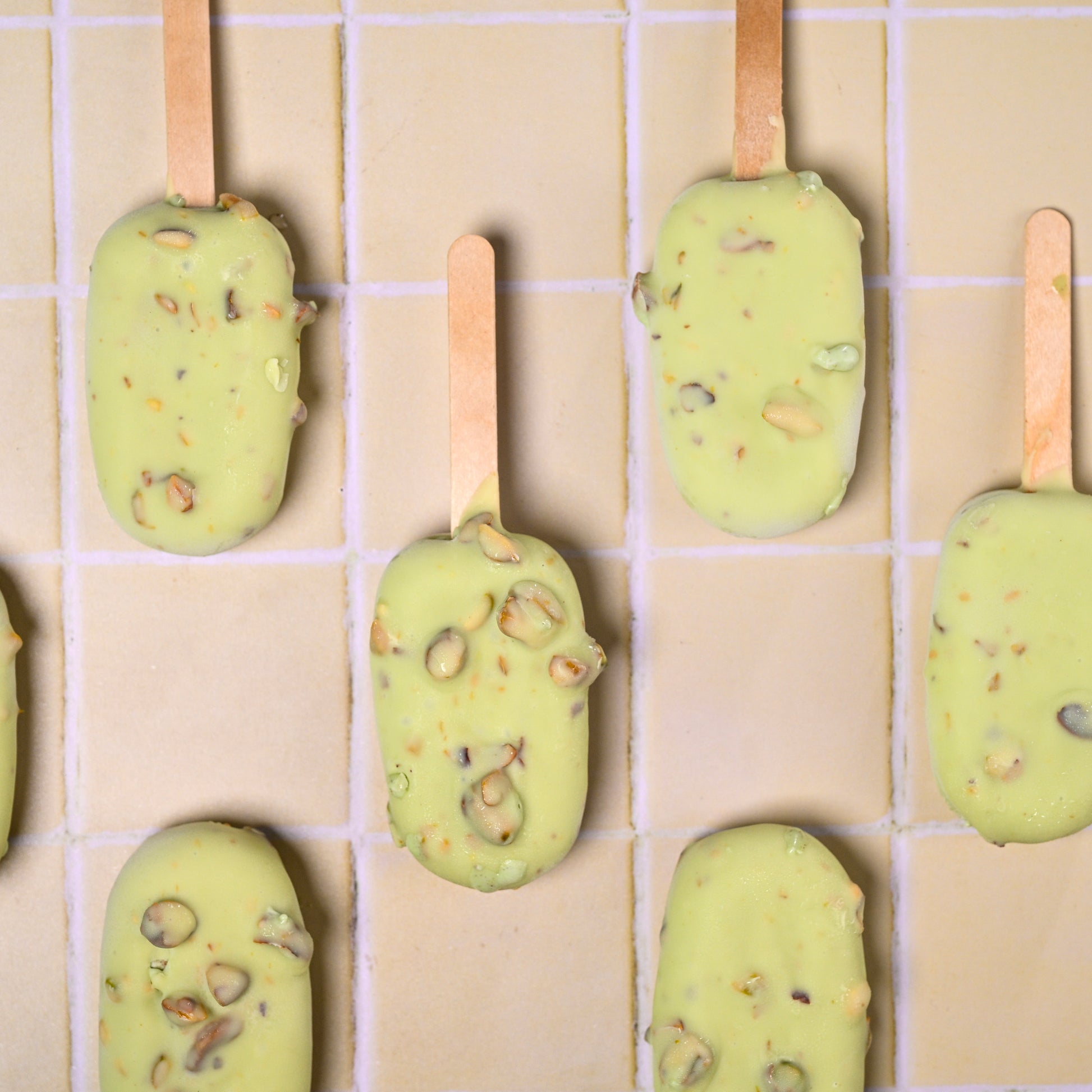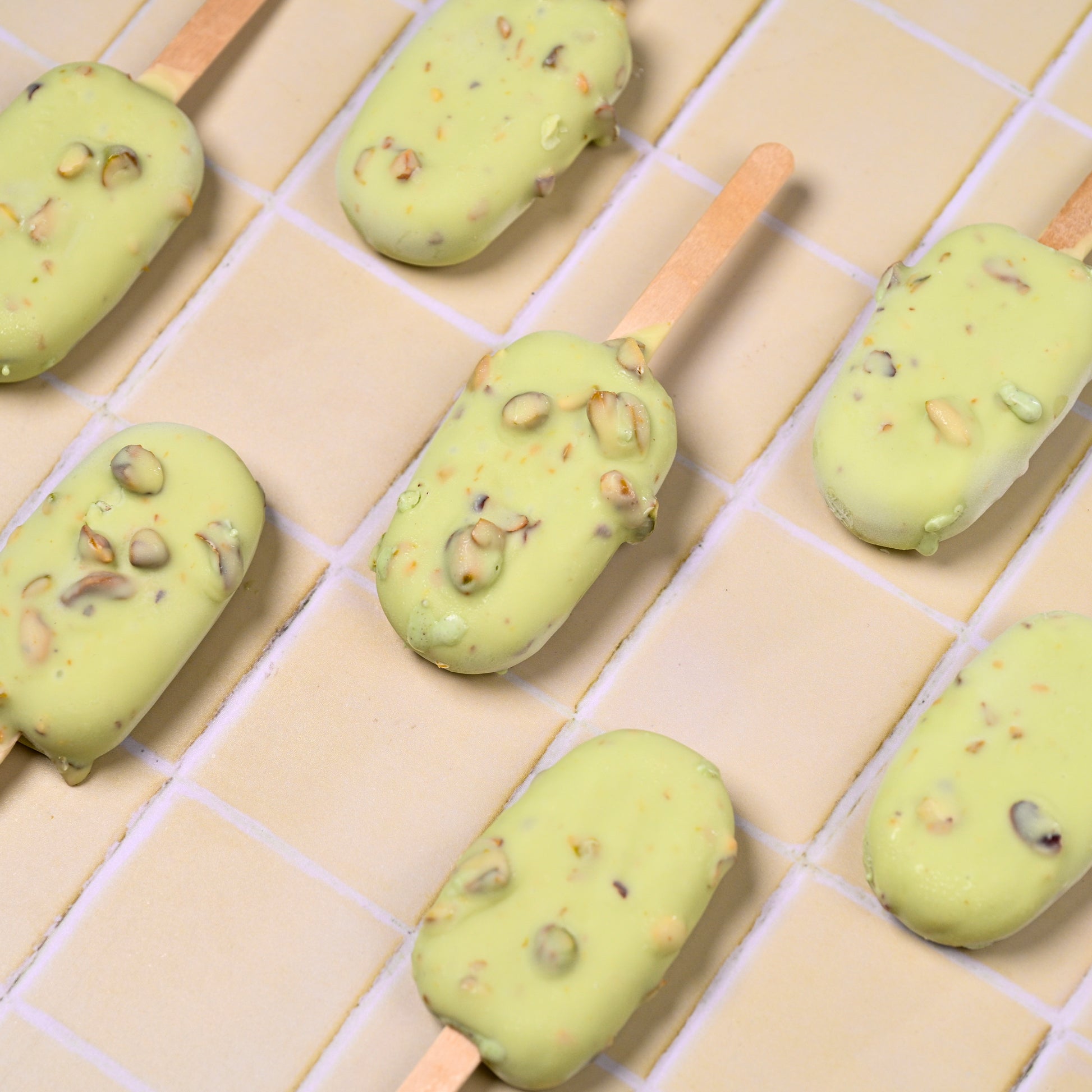 Beat the summer heat with our Pistachio Popsicles, a sophisticated frozen treat that combines rich flavors and delightful textures. Each popsicle features a crisp white chocolate shell studded with crunchy pistachio slivers, creating a sweet and nutty exterior. Inside, you'll discover a creamy pistachio ice cream filling, offering a luxurious and smooth experience with every bite.